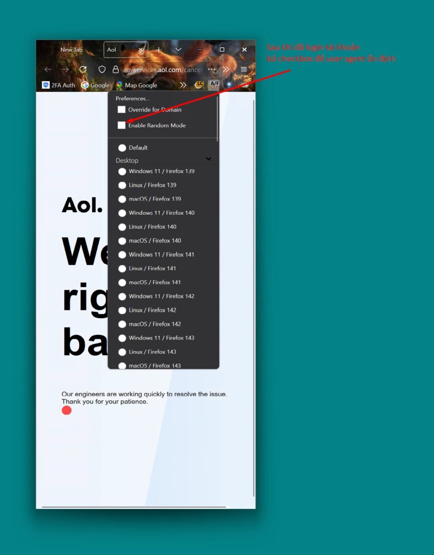 Tắt ngẫu nhiên User Agent sau khi đăng nhập tài khoản